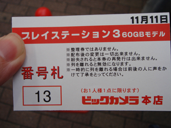 11/6の20時現在で、新宿の家電ショップでPS3の順番待ちしてる奴が既に居るとかいないとか。