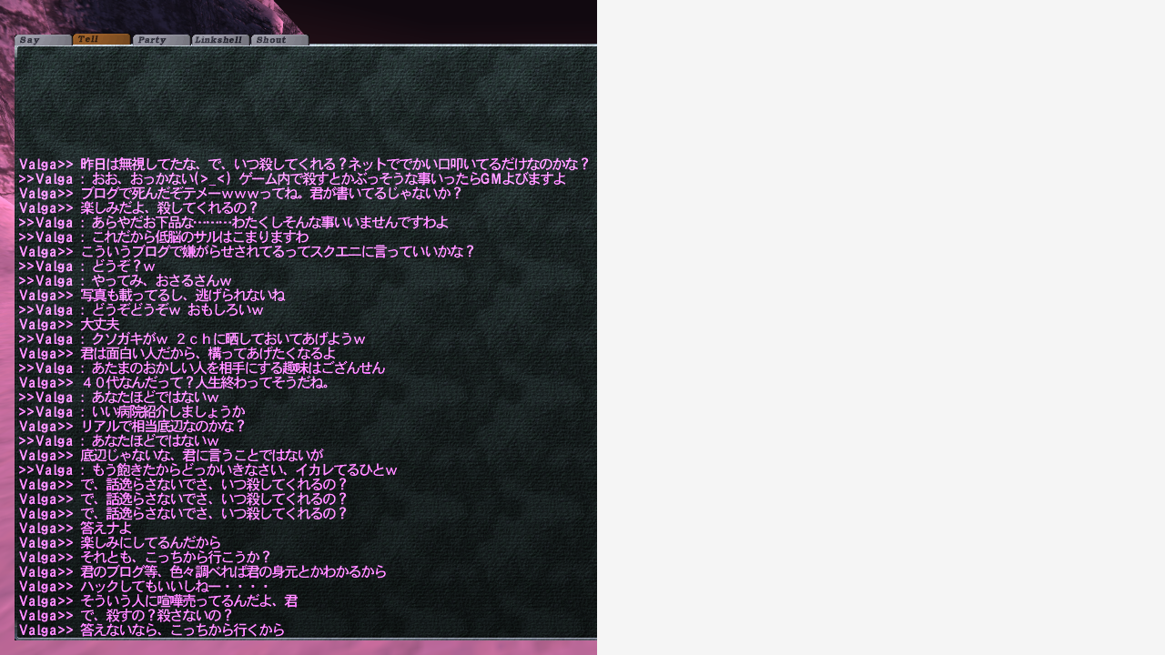 投稿日: 2012/02/03/ 07:35:40クソ野郎は、やはりクソ野郎で。 つい先日クソスレでこいつの名前が出てるのは確認してたけど、やっぱクソはクソなんですね。 どうして鎧が主催なのに、3人目が居るのか先に聞いておくべきだった。 このクソ野郎はテルしても当然返事返ってきませんですしw お前なー、売りますシャウトかけておいてロット勝負とかあとだしするな このウンコ野郎のFiroめ!! 死ねこのクソガキャ!! そーいうクソッタレな事してっから胴でねーんだよ、ざまぁwwwww
