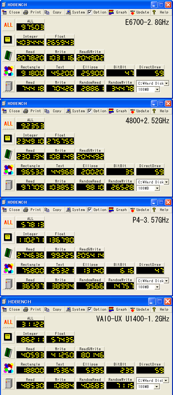 メインサーバーがP4-3.0GHzのメモリ3072MBなんですが、デスクトップの3号機についてるペン4を転がしておくには惜しいかな、流用しようかななんて思いつつ、デスクトップ3台のベンチとかとってみる。