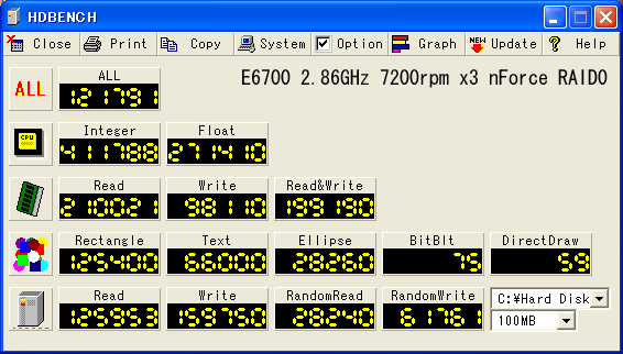 4800+のAMD系マザーでもHDD3発のRAID0は試したのに、あんときは133Mは越えなかったんだよな?。これって10000rpmのHDD3台でRAIDちゃんと作ったらそれなりに速いのだろうか?