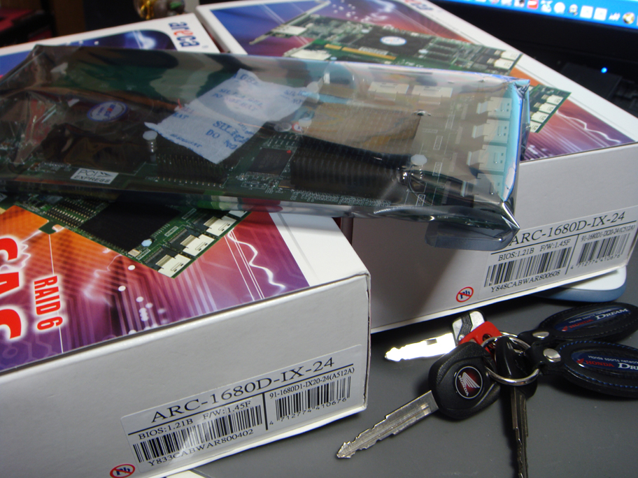余りRAIDカード一斉処分、最後の品はAdaptec51645。 落札価格は71,000円。こんだけつけば満足です(>_<)ノ 色々と手間のかかったAdaptecでしたが、これにてやっとウチからアダプ全廃となりますた。 Arecaのカードがいまんとこhddの相性問題なんてまるっきし無縁で、めちゃ快適に動いてることもあって この先アダプのカードはもう買う事も無いんだろうなぁ………なんて思ってたり。 アダプテックといえばSCSI!ってイメージがあるんだけど、SASカードなのにSATAで使ってたりしたのが悪いのかw 俺様的メモ(出品物と落札価格メモ) Adaptec RAID 31205 ¥45,500 PROMISE EX8350 ¥18,000 3ware 9590SE-8ML ¥40,500 Adaptec RAID 31205 ¥49,600 Adaptec RAID 51645 ¥63,300 Adaptec RAID 52445 ¥70,999 計288,000円(出品手数料込まず) ちょうどAreca1680iX-24+mem2GB+BBUの2セット分くらいの値段になったわねー。結果オーライwww