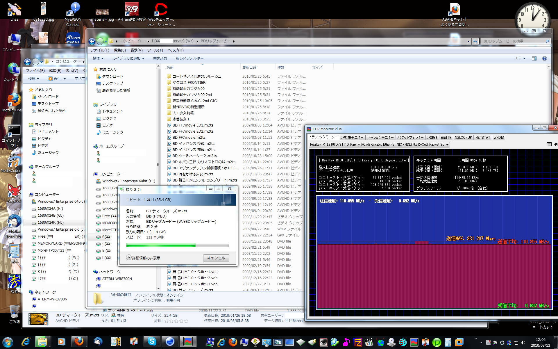 送り側、受け側共に Windows 7 Enterprise 64bit で Areca ARC-1680ix-24(キャッシュ2GB) 1.5TBhdd x8 RAID5