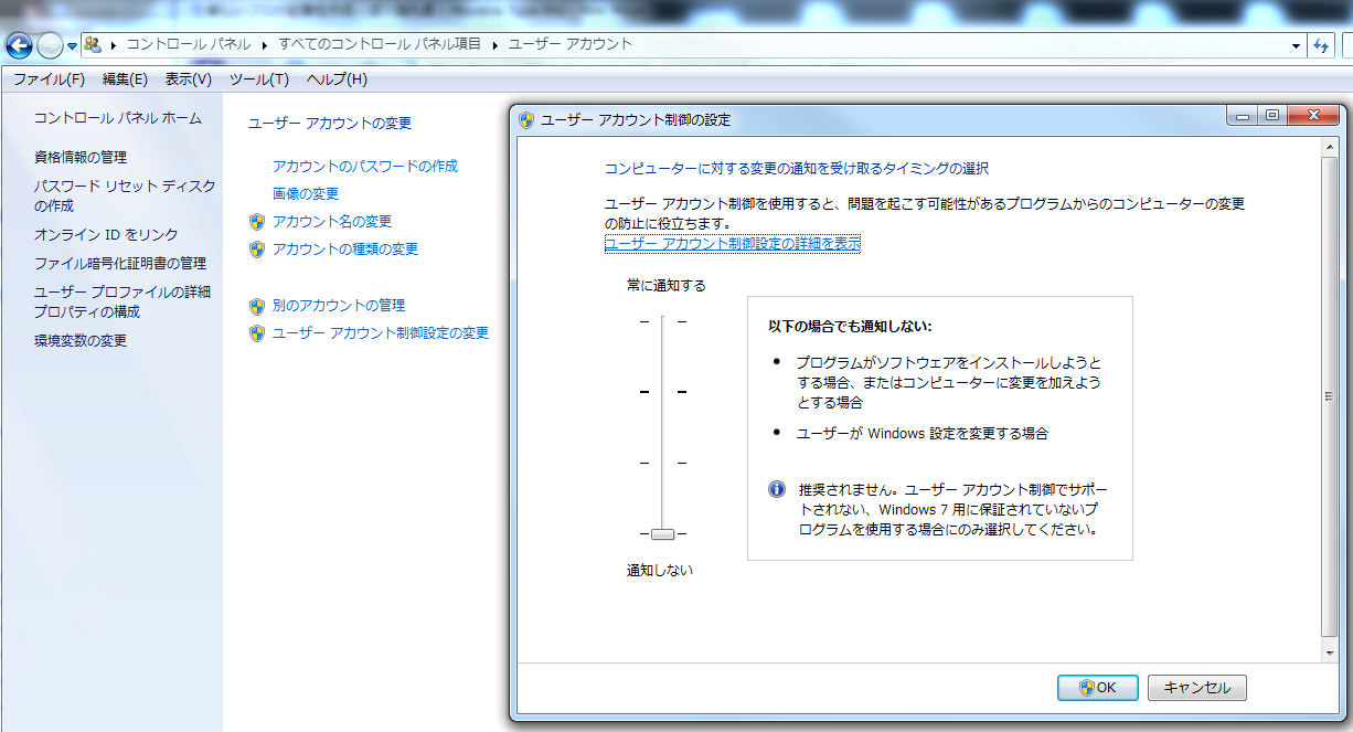 ユーザーアカウント制御(UAC)のオフと共に、OS入れ直したら最優先で設定する最重要事項ぞな………