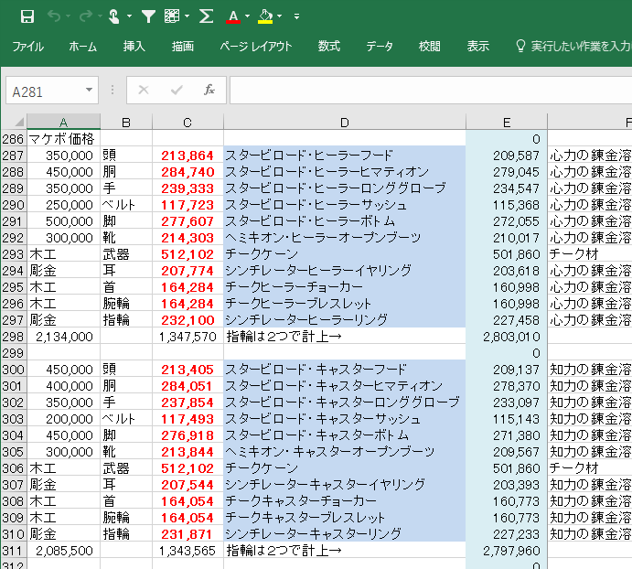 ヒラとキャスの左側防具6点の、現在出品価格と原価表ですw