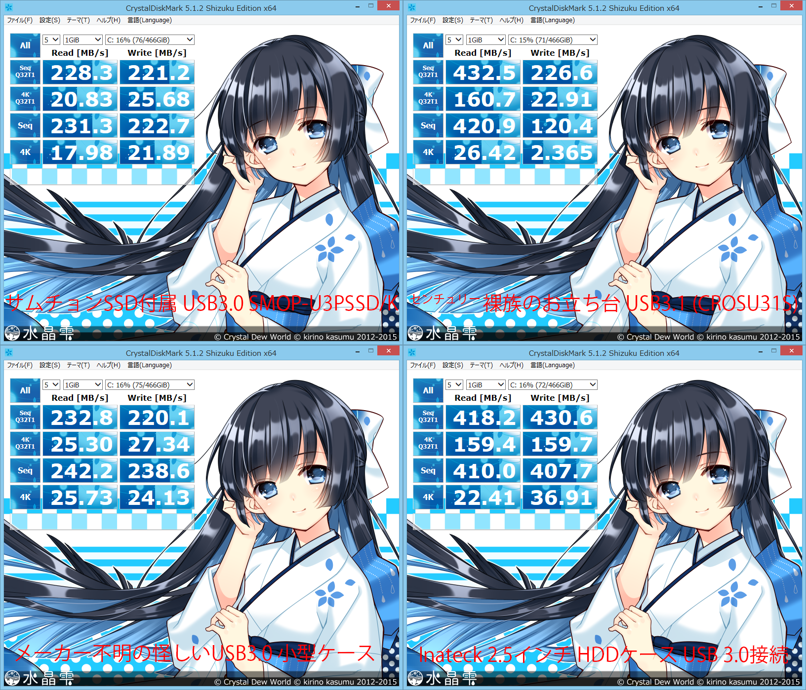 おまけの画像右上は、もちろんUASPモードに対応してる、センチュリー裸族のお立ち台シリーズ最新版のベンチ結果。電源接続が必要だけど、