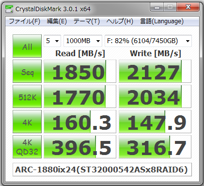 RAID6でまさかの1000MB/s大台突破とな(>_<) こりゃSSDで試したらもっとヤバいんじゃ。