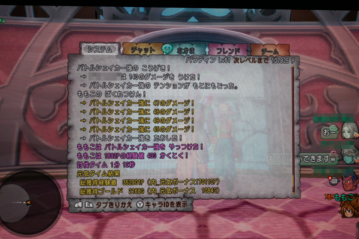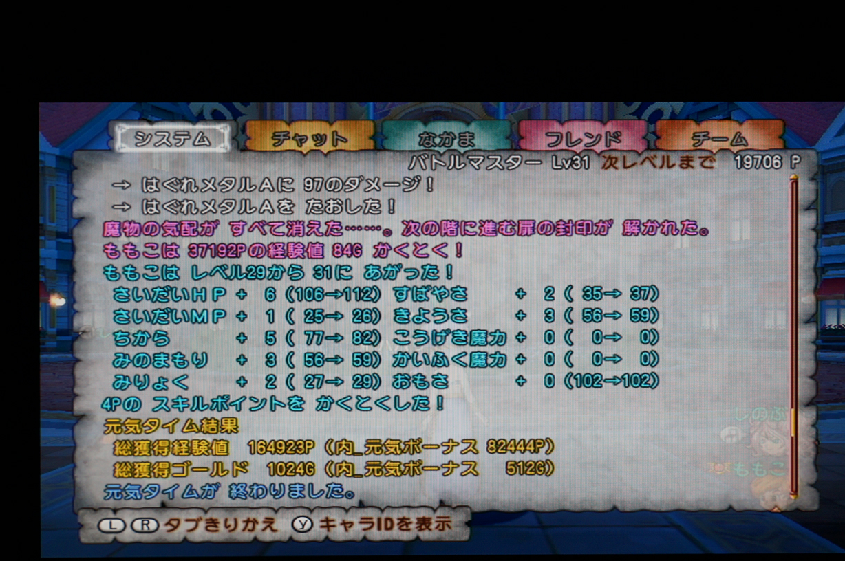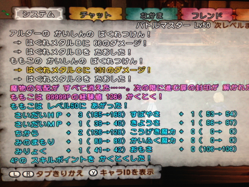 しのぶがLv34パラで、ほかの3人がLv1バトマスor賢者という構成だったんですが、しのぶは無事Lv41に、メインはLv31になりました。