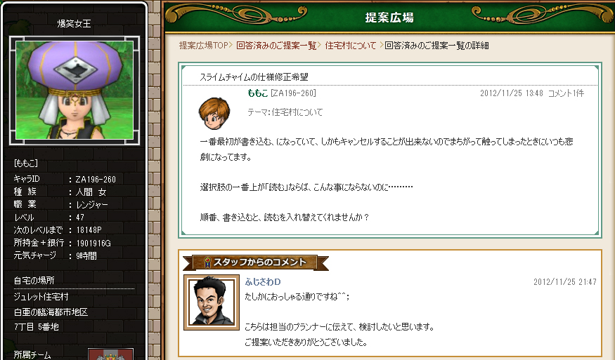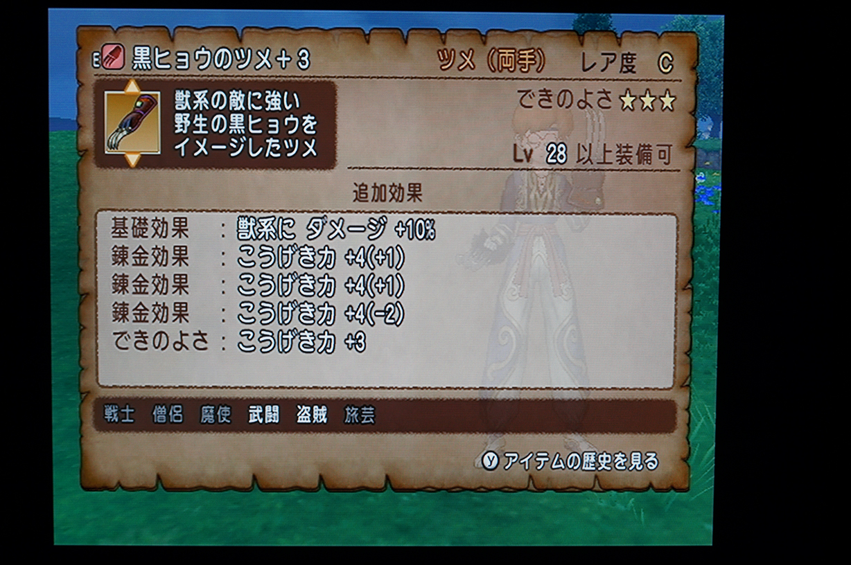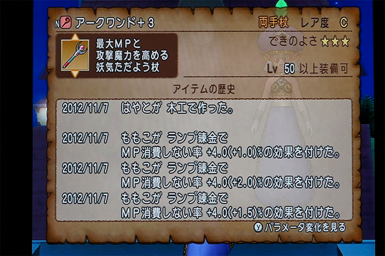 羽振りよくなったんで、やっとももこに無法者の、満足いく数値のフルセットを購入(>_<) 装備してる分だけでも60万ゴールド越えの、手3回やり直した全損分いれると80万+かかってる事にorz 武闘家のために80万とかパネぇ;; ついでにしのぶのマスターアームもゴミ装備だったんで、これも許せなくて3回リトライ。失敗失敗パルプンテ塗りつぶしになって、 仕方ないんで最後の12%で妥協orz ぎぎぎ......... しかしまあなにかな、ドラクエの錬金というシステムは。 やればやるほど、間違いなくプラスで終わるシステムぱねぇw イカサマとかグラサイって次元じゃない、明らかに仕組まれてる結果というか。 時間帯によって乱数表が変化して、入ってるときはひたすら続行、入ってない時はすみやかに中断でボロ儲けが続きます。 もうちょっとマトモな乱数組めなかったのかね、エニックスの開発は(苦笑) ダメなときはなーにやってもダメなんで、さっさと辞める勇気も必要です。