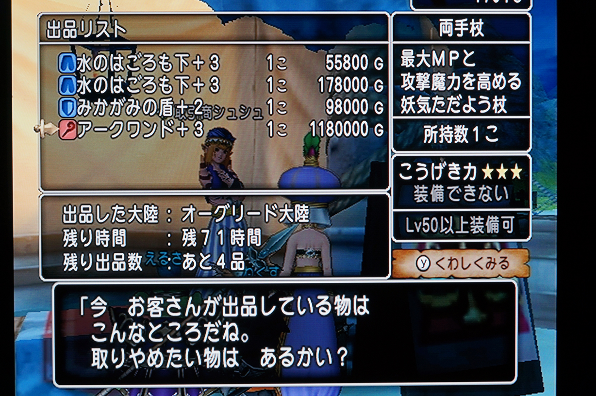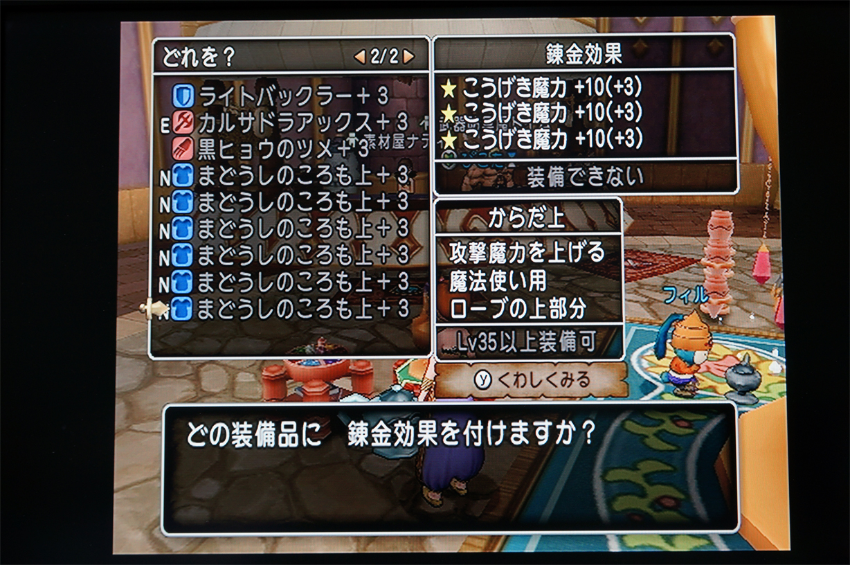いまはごろも下のこうげき魔力+30が52,800G(回収額50,160G)だから、最低でも+30を10個完成させなきゃモトが取れない!?あるぇ??;;