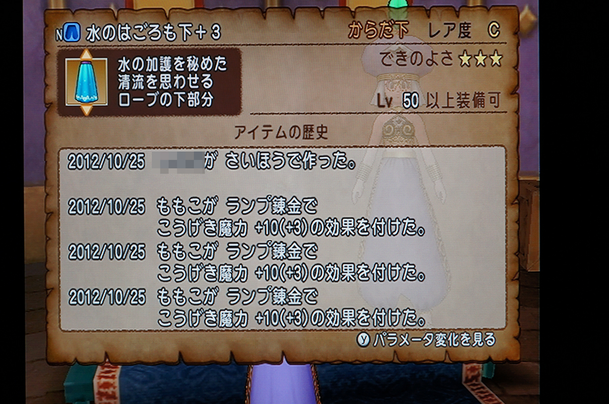 めでたく4回目の完品錬金完成です。やっと水のはごろも上下が+39になりましたw これでもうしんりセットいらないわw(安くなったら作るけどw