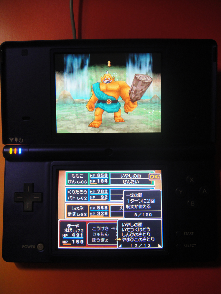 Lv41でどーやっても勝てなかったメギストリス領だけど、Lv43になったんでリトライ(>_<) サポート仲間の魔法使いがマホトーンなんか使ってくれるわけもなく、完全にゴリ押しで叩きつぶす事に………orz 魔法使いが殴られると全く火力にならないので、仕方ないので編成を戦士、戦士、僧侶、自分も僧侶の4人でクリア。 相当時間かかったけど、とりあえず勝利(>_<); 調子に乗ってそのままヴェリナード領も行くのがツライからクリアしたいにゃー、ってノリで突撃。 最初の敵は編成を、戦士、魔法使い、僧侶、僧侶でなんとかクリア、ボスの方はまた戦士戦士に戻してクリア。 メギストリスの方が強いかな。こっちは43じゃなくてもクリア出来そう。ハメ殺せるし。 しかし………まほうのせいすい、まほうの小ビンともに飲んで飲んで飲みまくりバトル………orz かなり無理してるけど、とりま、勝てればいいやみたいなw 更に調子に乗ってそのままカミハルムイも突撃したら2戦とも瞬殺終了(>_<); これは絶対無理だわーorz
