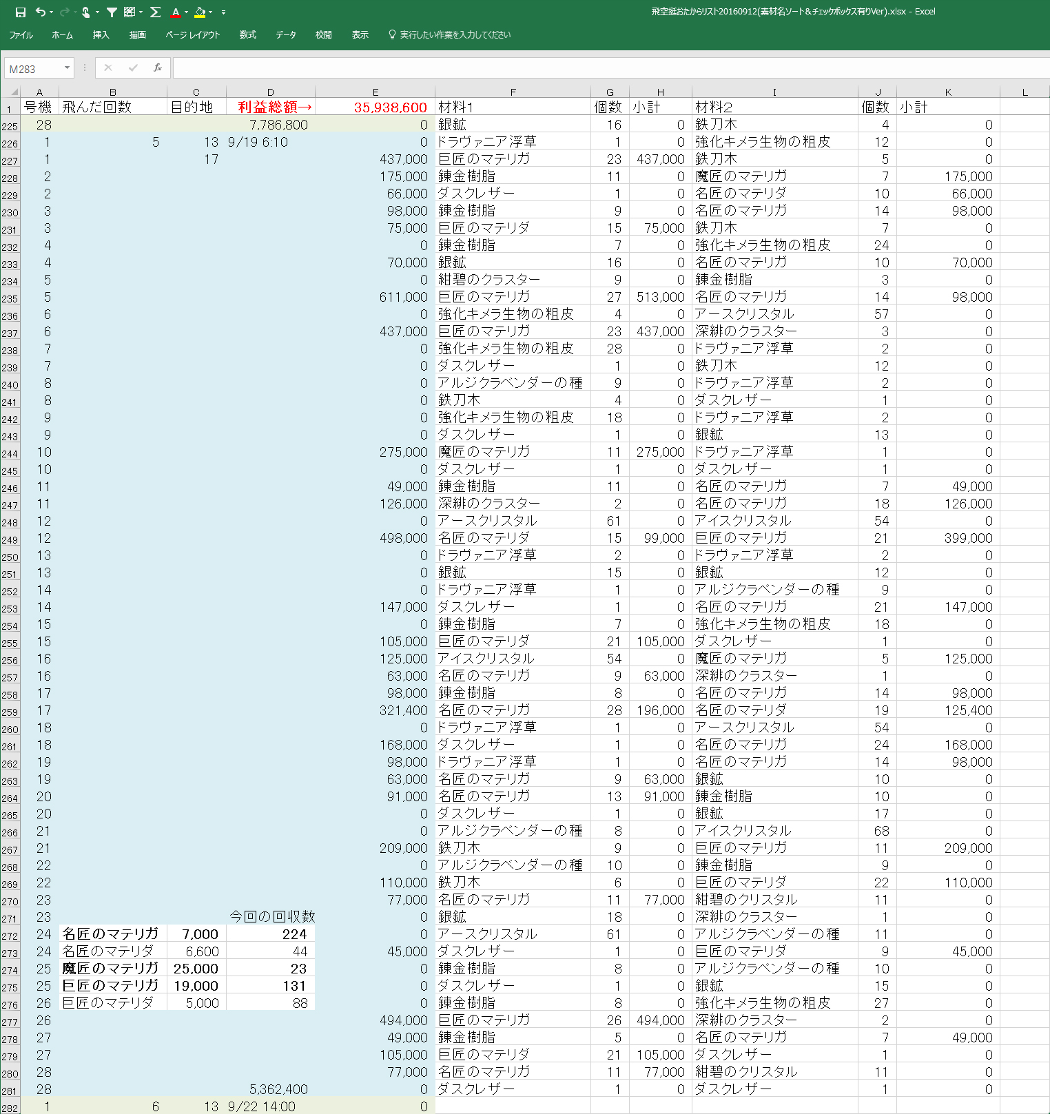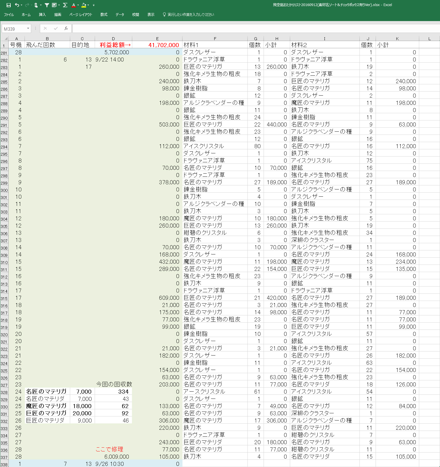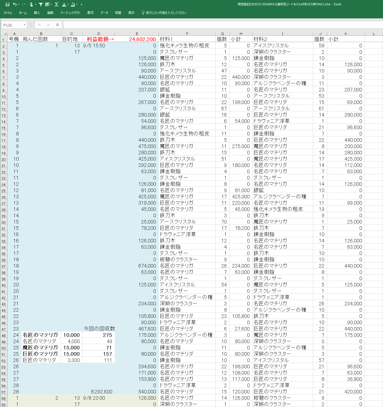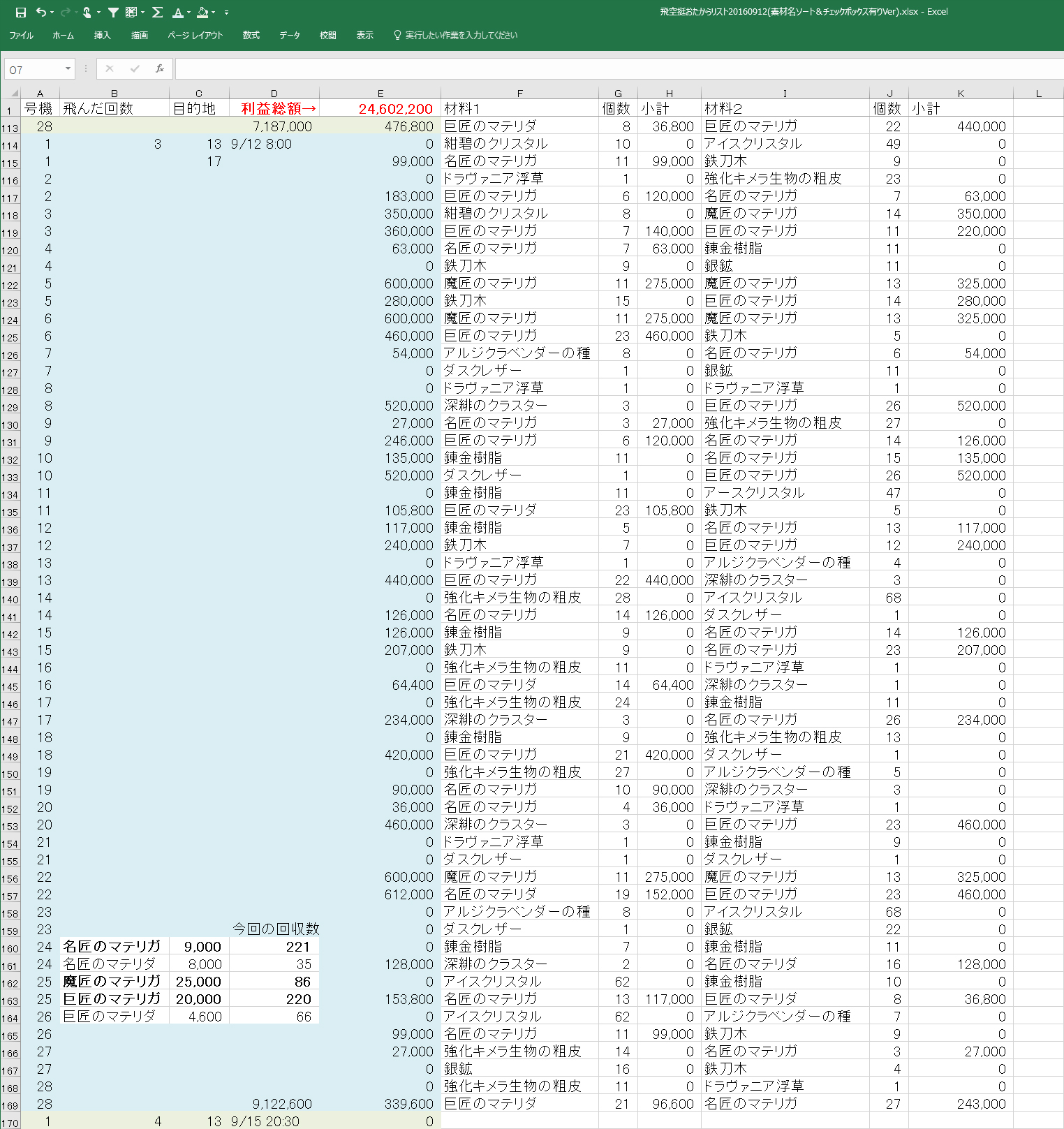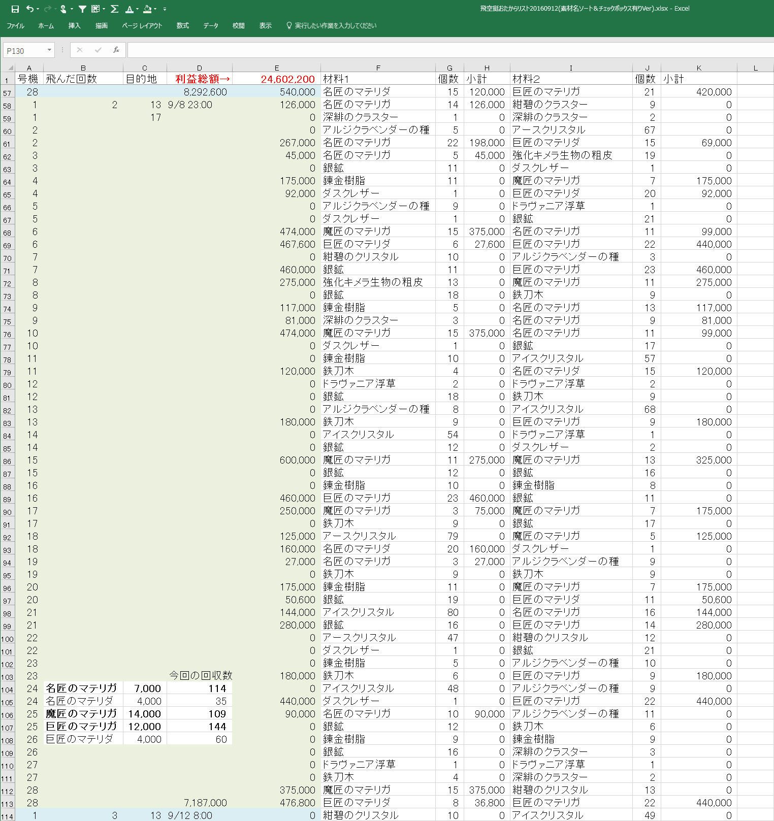 ※追記 エクセルを使いながら電卓を叩いてる子はダメな子らしいので、電卓使わなくてもいいように、マテリアごとに何個拾ったかを集計する場所を追加(>_<);