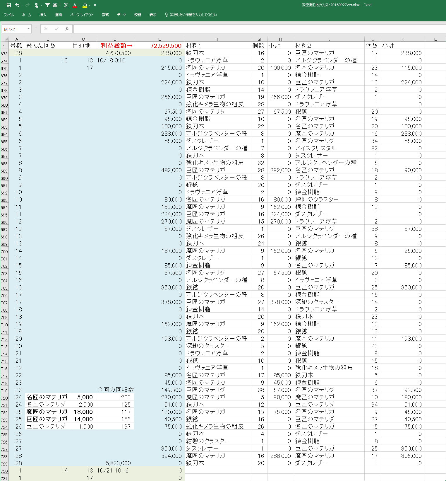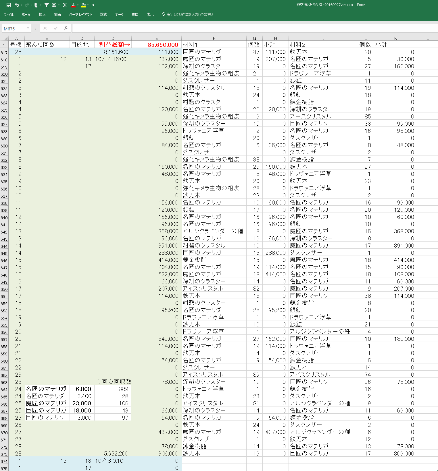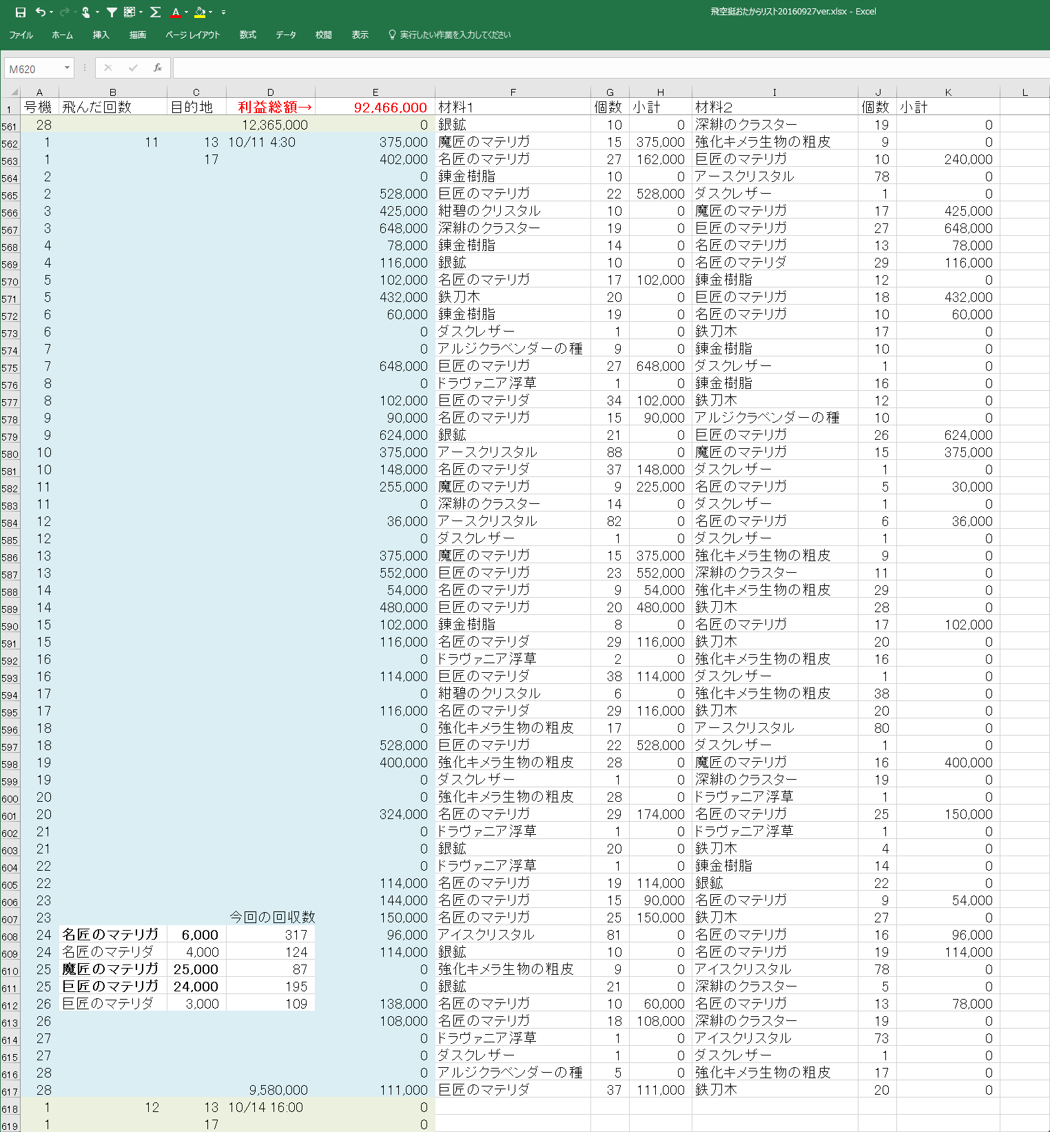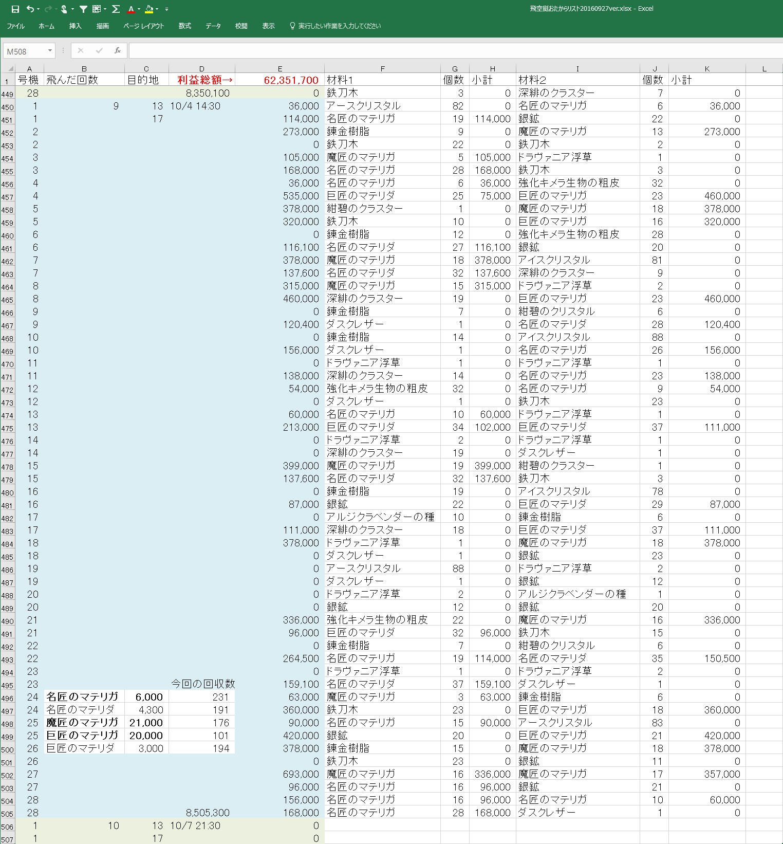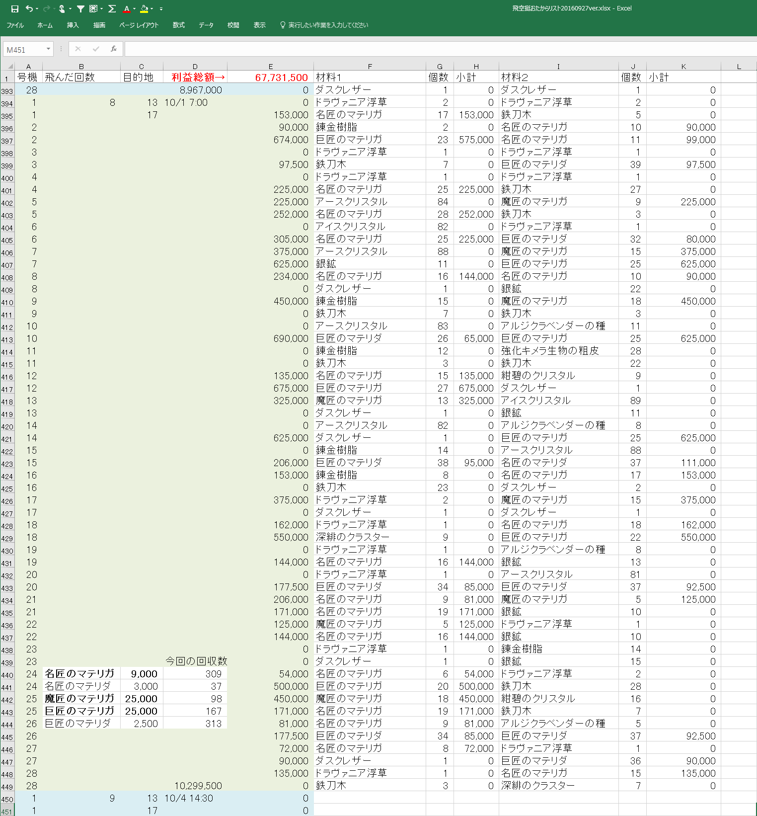 ※追記 エクセルを使いながら電卓を叩いてる子はダメな子らしいので、電卓使わなくてもいいように、マテリアごとに何個拾ったかを集計する場所を追加(>_<);