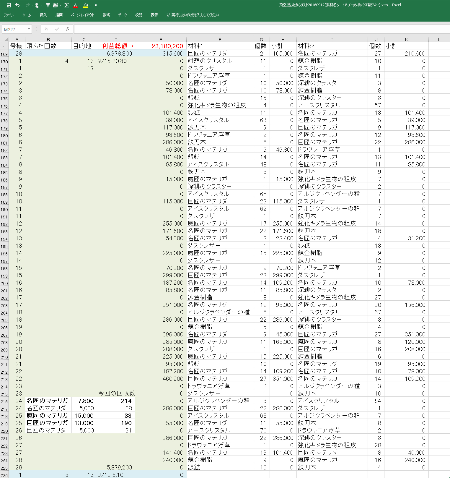魔匠マテリガ13個(現在価格30k)、巨匠マテリガ135個(現在価格24k)、名匠マテリガ131個(現在価格5k)、巨匠マテリダ59個、名匠マテリガ15個。