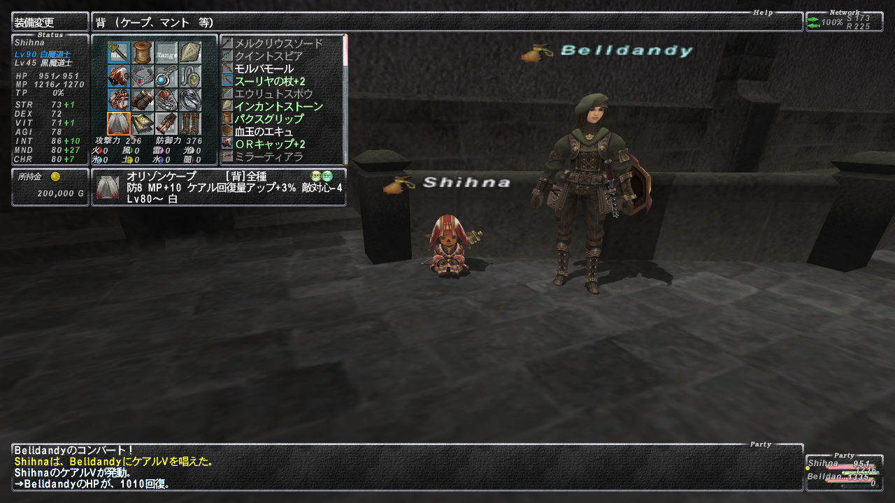 こんなカンジのテケトーな装備(回復量アップ44%)で、通常エリアのケアルV回復量が1,010hp