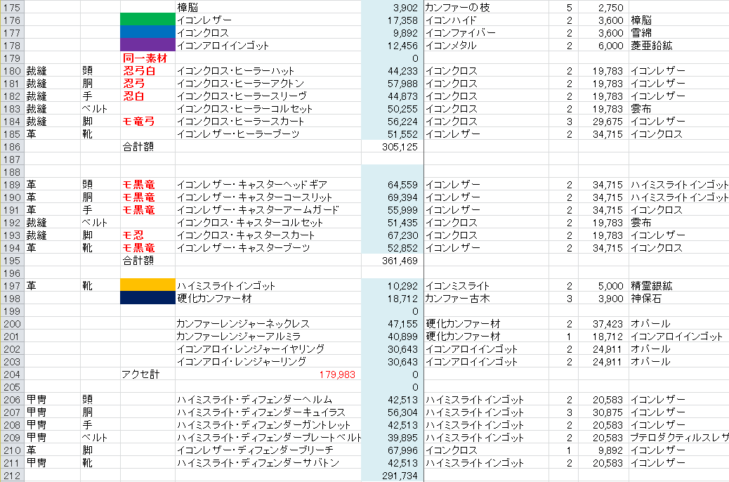 あ、あと、タンク防具は素材費計算したら、脚以外(脚だけ革なので高い)平均価格6万でした。