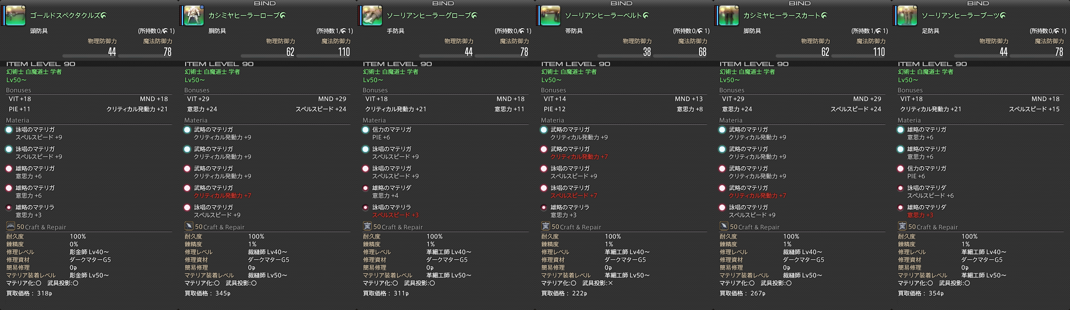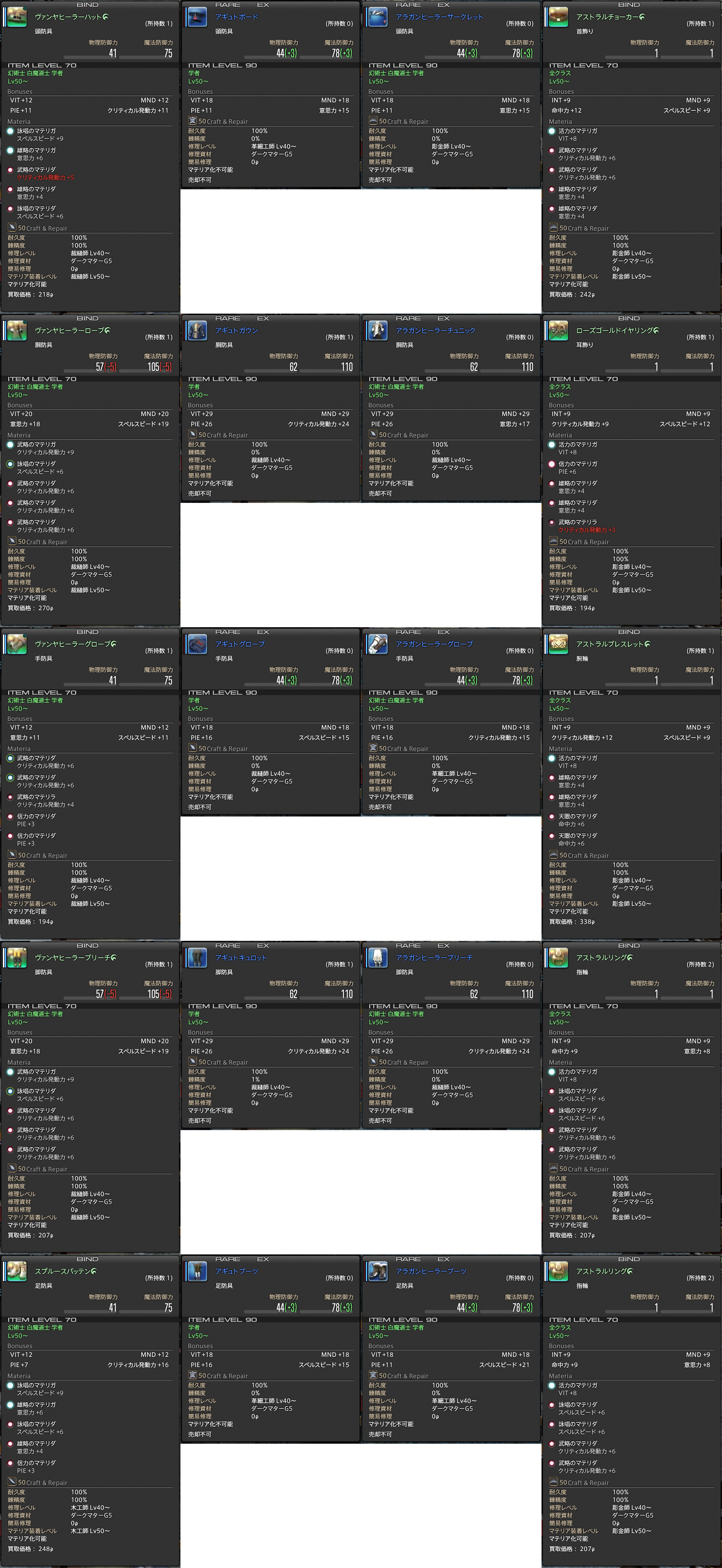 手持ちのヴァンヤがそこまで悪く無い性能なんで、着替えに躊躇してしまうのが(>_<) アギュトガウンと、アギュトキュロットは迷うところ無いので、速やかに交換済みで。 アラガンヒーラーグローブはやはり、何が何でも欲しい所。問題は頭と靴だなー………うぐぐ。 靴は甲乙付けがたい………最終的にはMND+6&VIT+6のほうが絶対いいんだろうけど、その代償でクリティカル-16が痛すぎるorz こーいう事を書いてるとまーた誰かに叩かれちゃうんだろうけど、なんかクリ16を捨てるのが忍びないw 頭も、詠唱速度-15&クリティカル-16の代償にMND+6&VIT+6で? そこまでするほどMND+6は大事なのか?悩んだら負けなんだろうけど、このトレードオフは結構デカイと思うの(>_<) MND1がどのくらい回復量に差が付くかは言われなくても実験済みだけど、こんなところで迷ってるようじゃいつまでたってもフィジク回復量1000とかムリだけどさーw せっかく大金かけて作ったヴァンヤが悲しぃ………所詮ヴァンヤに大金突っ込んだヤツは負け組かー?(>_<); 手持ちのアクセはまったく迷うところなし、すべて完璧………と信じる(>_<)ノw むしろやりすぎw