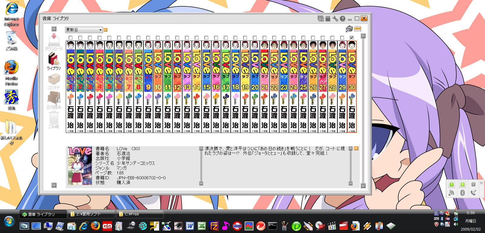 結局あのマンガを書店で新品購入する事は諦めましたorz 無理!(>_<); VAIO type Pにebi.BookReader3ってのが入ってたんで、そっちで全巻購入しちゃったYO! プリントスクリーンキー封じしてあるクソソフトだったんで、それを華麗に排除。 どんなプロテクトをかけようとも、それを解除する奴は解除するんだ。何やったって無駄無駄無駄ァァァァァァ!! こっちの方が絶対綺麗だし、typePを横にして見れば結構便利だからこれで佳かったのかも。 書店で買えなかったのも流れかもしれぬ。 本1冊買うのと同じ値段取られてる訳ですが、お気軽さからどんどんポチりそうで電子図書てのは危険ですネ(>_<) BBもついでに欲しかったのだけど、あっちは31巻揃い………南無(>_<) ダメおやじとか、女神さまも一気大人買いしそうで怖いw やだよ?、形の無いものに10万とかの請求きちゃったら(>_<);; シティーハンターとかキャッツアイも電子図書版で欲しいなぁ……… けど、ホントに読みたいのは横山三国志(死ねるww