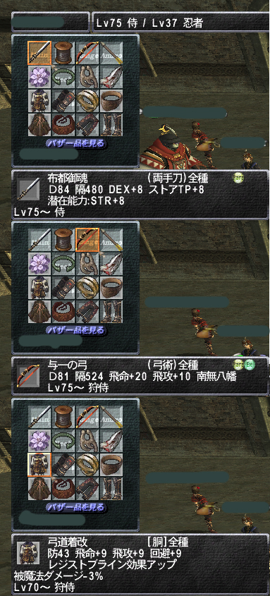 投稿日: 2009/04/27/ 04:38:25 投稿者: にゃんこ猫鯖は怖い所です 競売履歴に残ってた弓道着改、出品歴しか残って無くて誰が持ってるのか判らなかったのですが わたしの定位置の真横にいたひゅむ♀が所有者と判明(>_<) しかも布都御魂と与一の弓、ギャッラルまで持ってるとか(>_<); とてもじゃないがこんな超絶廃神装備真似出来ないっ; 弓道着改だけ欲しいにゃ?ん;;;;;; でもまあ所有者がタルとかエルとか♂じゃなくて、ひゅむ♀でよかった。お似合いでしたよっ(>_<);