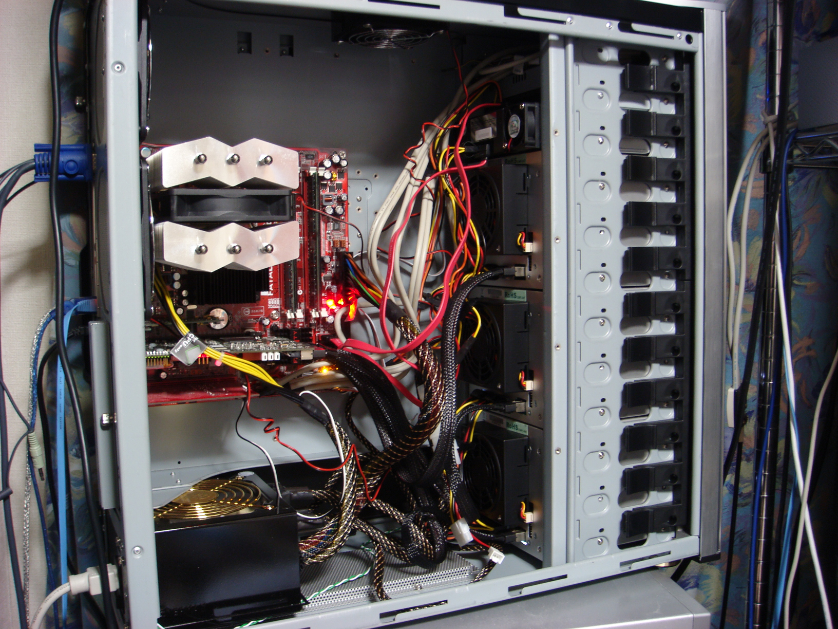マルチレーンという接続方法がありまして、RAIDカードなどの4台ひとまとめの端子から、ダイレクトに4台ケースに接続するものがありんす。今回はマルチレーン3つ持ってるRAIDカードからチョクでそんなケースに繋いだので、配線がかなりサッパリしました。鯖運営なんだからこれが本来の姿というか………(でも、この鯖はこのブログなどの鯖ではなくて、ただのファイルサーバーですけどw)