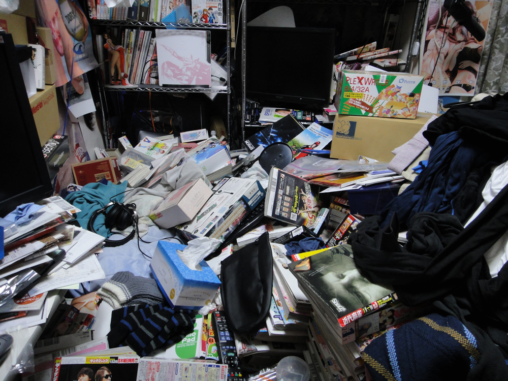 本棚も全開で、中身全部撒き散らしてくれるし奥のモニタの手前がベッドのある場所なんだけど、もう完全に埋もれてるし。部屋グッチャグチャになってワラタ。
