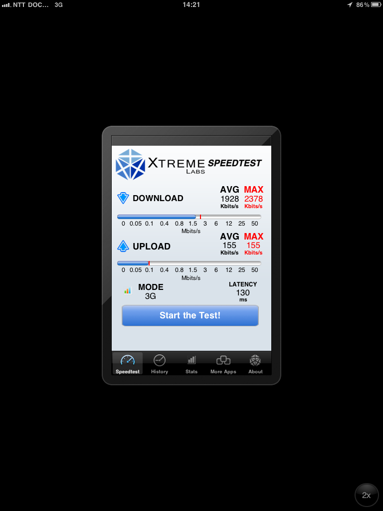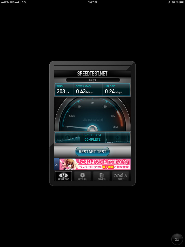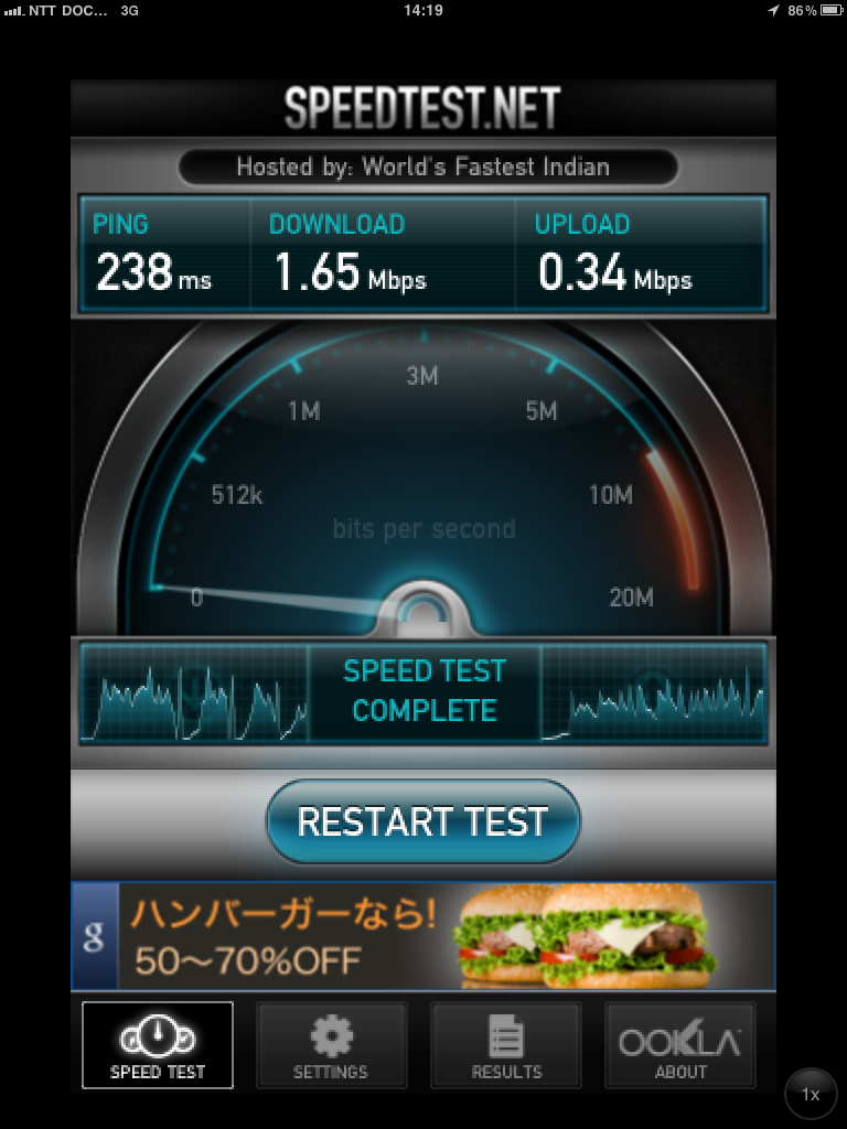 まぁ画面左上を見ればどの回線事業者なのかは一目でわかると思いますが、左がiPad1でのバンク回線、右がiPad2のドコモ回線です。やっぱドコモ圧勝ですw
