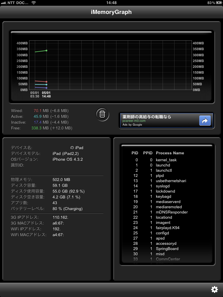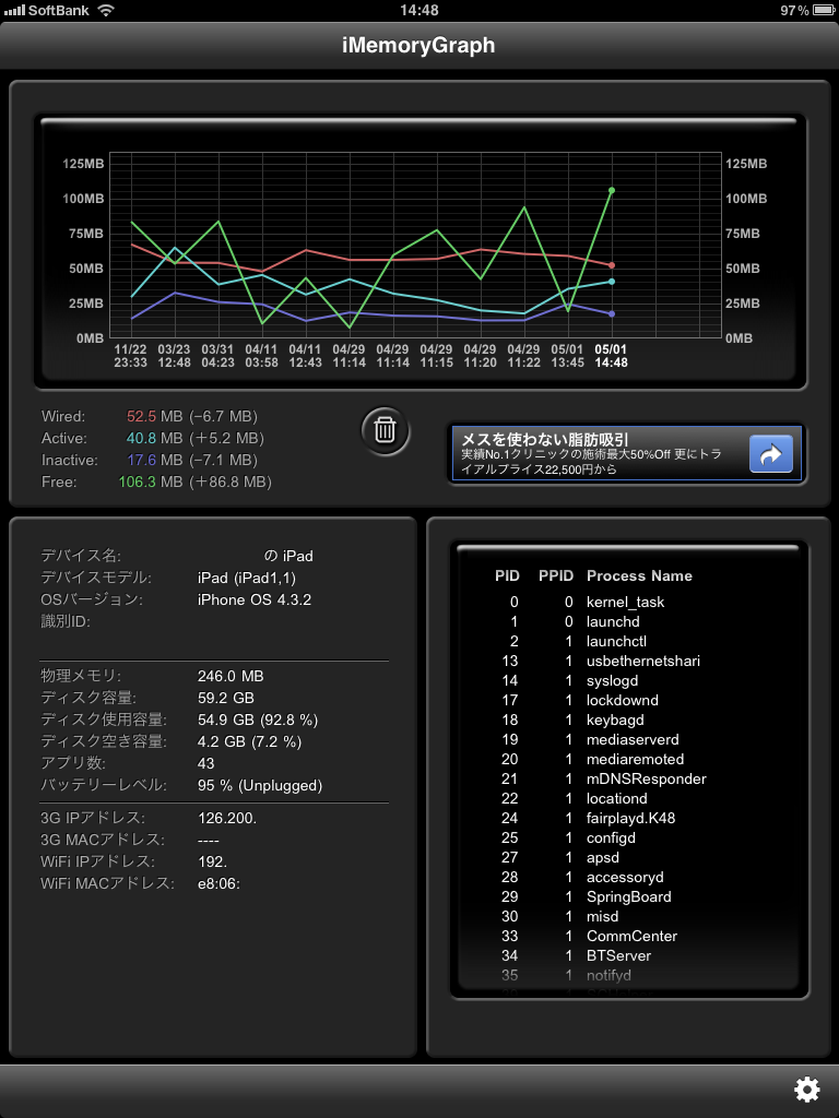 左がiPad1、右がiPad2。空きメモリ量がぜんっぜん違うもん、ここらでもかなりの速度差になりそうです。