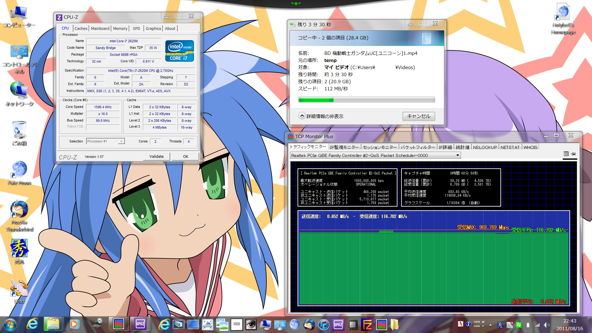 投稿日: 2011/08/14/ 07:20:03 投稿者: にゃんこVAIO Zは素晴らしい メインマシンからVAIO Zへの有線ファイルコピー。やべぇ、超速いんですけどwww 969.9Mbpsかー。ノートパソコンなのにこんだけ速度出るのはマジでやばい。 ていうかメインマシン完全に喰われてる気がするんだけど、どうか?(>_<)