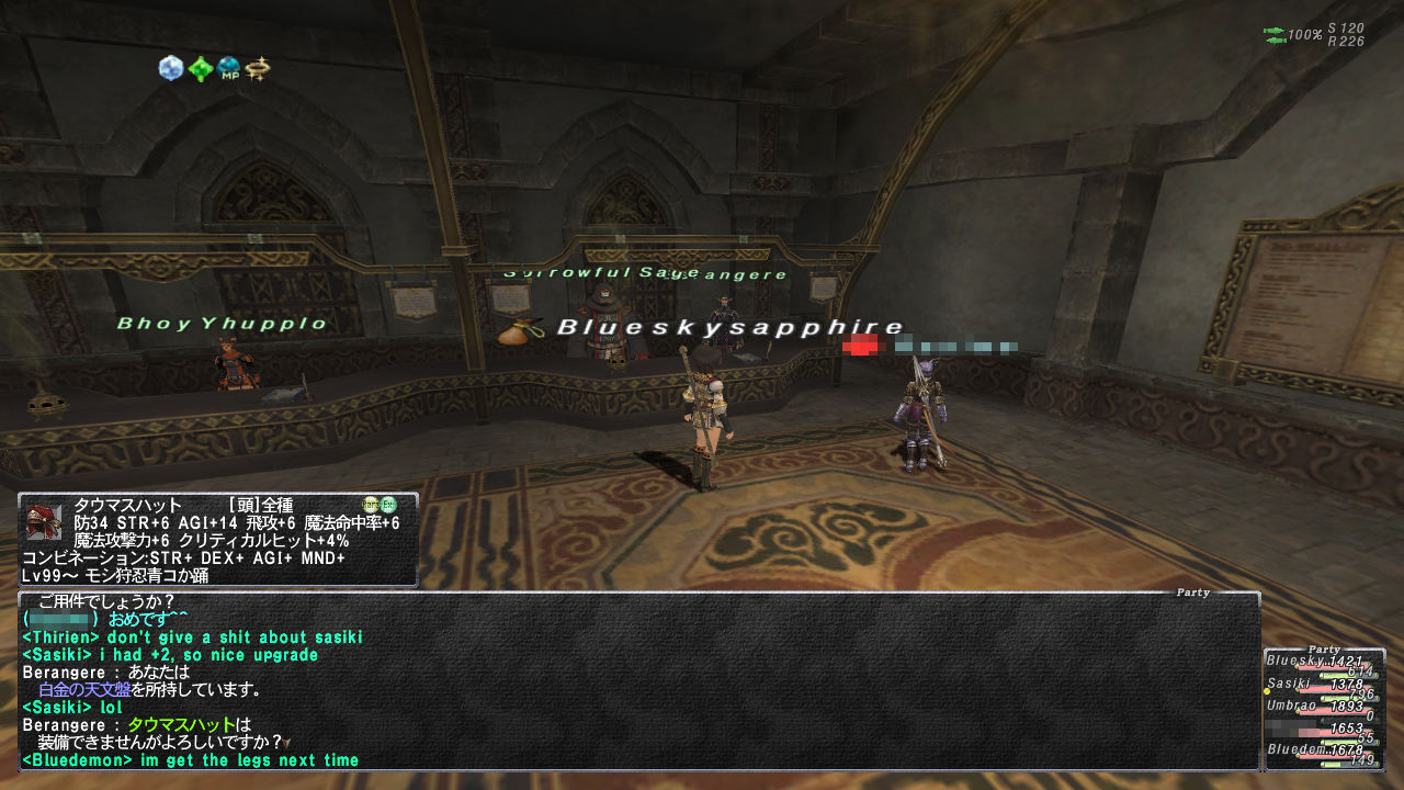 投稿日: 2012/04/07/ 06:16:32 投稿者: にゃんこナイズル100層(突入2-3回目) やばい、3回目のナイズル100層突入でとれちゃったwww 本体でも強化魔法スキル487の学者を作って置いたら、誘われて、ランプ待機でいいとかの重役待遇です。 これでおみやげ貰っていったら怒られちゃうくらいなにもしてませんwww ありがた~♪w パッと見、まだ持ってる人が見当たらなくて優越感パネぇっす(笑) 2回目も80層はクリア出来ていて、お土産もうひとつゲットだったりして。 えへへ♪