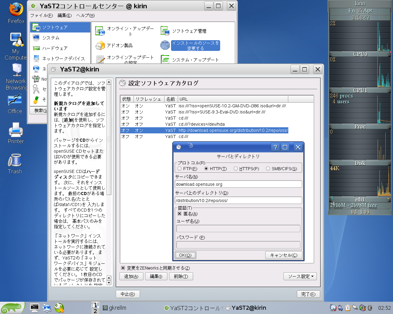 追加>http> にて、http://download.opensuse.org/distribution/10.2/repo/oss/ を指定し、