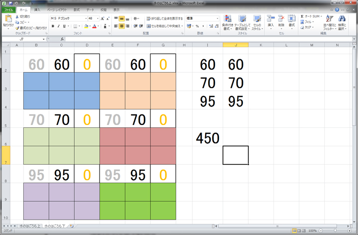 淡いグレーの数値が目標値で、オレンジのゼロにその下6マス色分けした部分に記入した数字のトータルがくるようにしてあって、