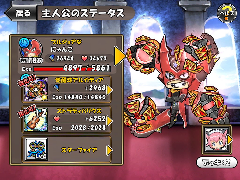 投稿日: 2015/01/12/ 08:08:28 投稿者: にゃんこ覚醒珠アルカディア なんかケリ姫やるからにゃあ、こいつが無きゃあやる価値が無い!という流れな気がして 今月入ってから4〜5万つぎ込んでんじゃないか?ってなくらい必死w 2回目の合成でやっと作れましたよっと(>_<)ノw 強化費用が捻出出来なくて、EXP振り切れてる装備ばっかですorz ヒィ(>_<);