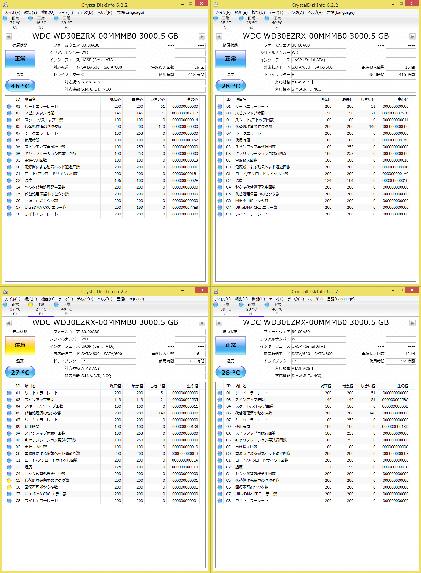 左上のhddはリードエラーでまくりで、RAIDカードから突然認識が外れて読めなくなって、超あせった子。