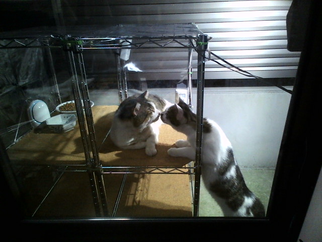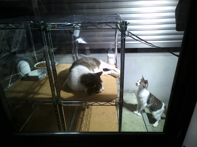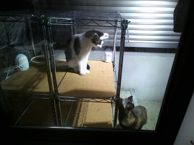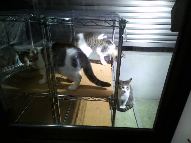 先日のおおあばれ状態。下でジっと待つ母猫ちゃん………子供が食べ終わるまで決して食べようとはしないもんなぁ、マジでにゃんこはエライっ。