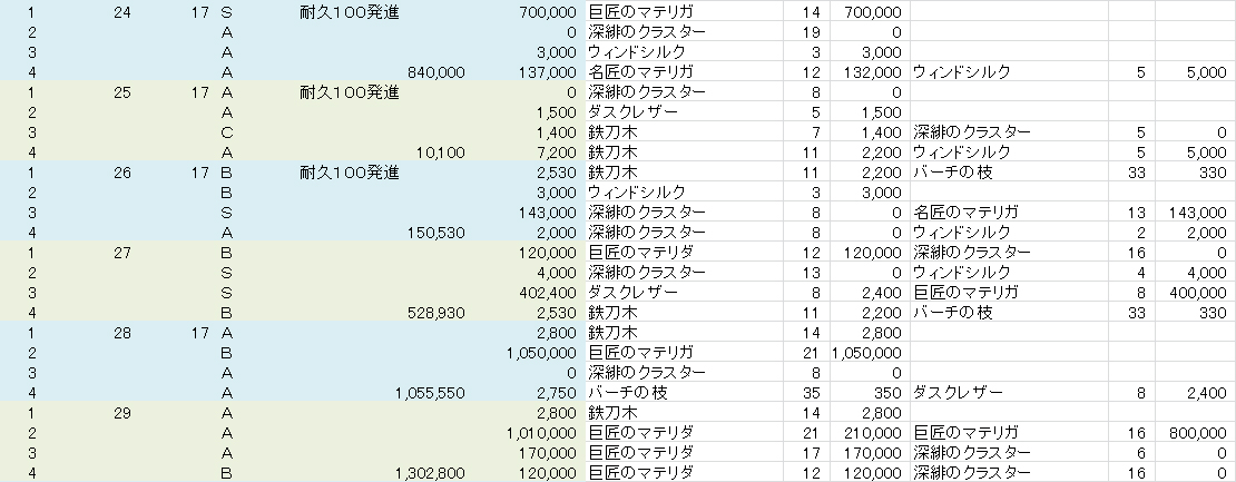 あとは上の表見て理解に苦しむ点が、24セット目で評価Sで巨匠のマテリガ14個なのに対し、