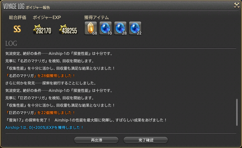 パッ、と開いた開幕からこんな画面が出ると、今日1日いい事ありそうだニャー(>_<)w なんてw 別に誰かをディスってるわけじゃないし、個人の性格の問題だろうからここは自分の事として書きますけど、 何機もある飛空挺、耐久度が4機ばらばらとか、発着時刻も揃ってないでメチャクチャとかだと悲しくなります(笑) 可能な限り、同じタイミングで収穫したいので、こんなカンジになってるわけですが。 なに?思ったよりこのブログの中の人は几帳面ていうかきまじめていうか、お堅い性格してるって?ほっとけ!!(>_<)w で、いまさっき19機の収穫タイミングが3日ちょいぶりにやってきたんだけど、こんな結果に(>_<)ノw うまい、旨すぎる………10万石饅頭以下略w