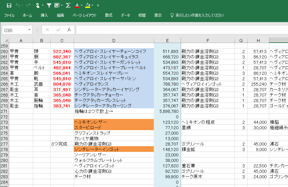 安く作ろうだなんて考えはサラッサラ持たず、強引にマケボからHQ素材をかき集めて、時間短縮こそ最優先で作成したリストです(笑)