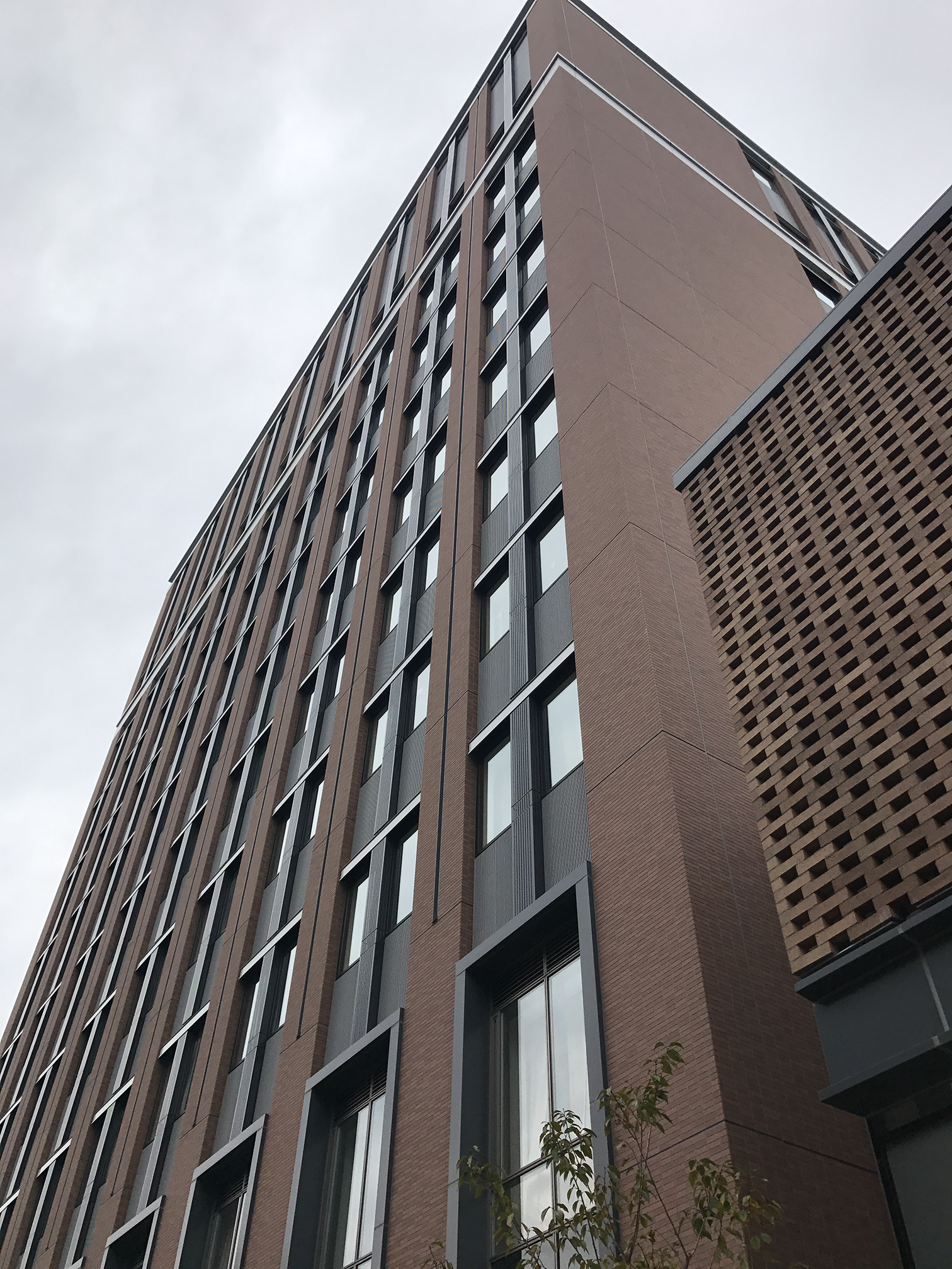 旧教員室棟と、高校教室(左側のみ)、それと校庭部分の3つを併せたほぼ正方形の敷地をぶっ潰して新築した新校舎(>_<)