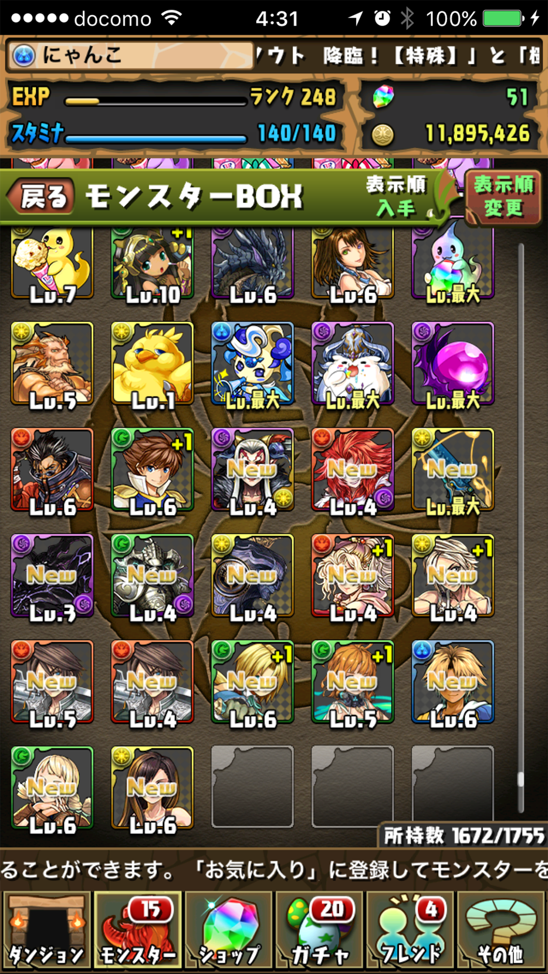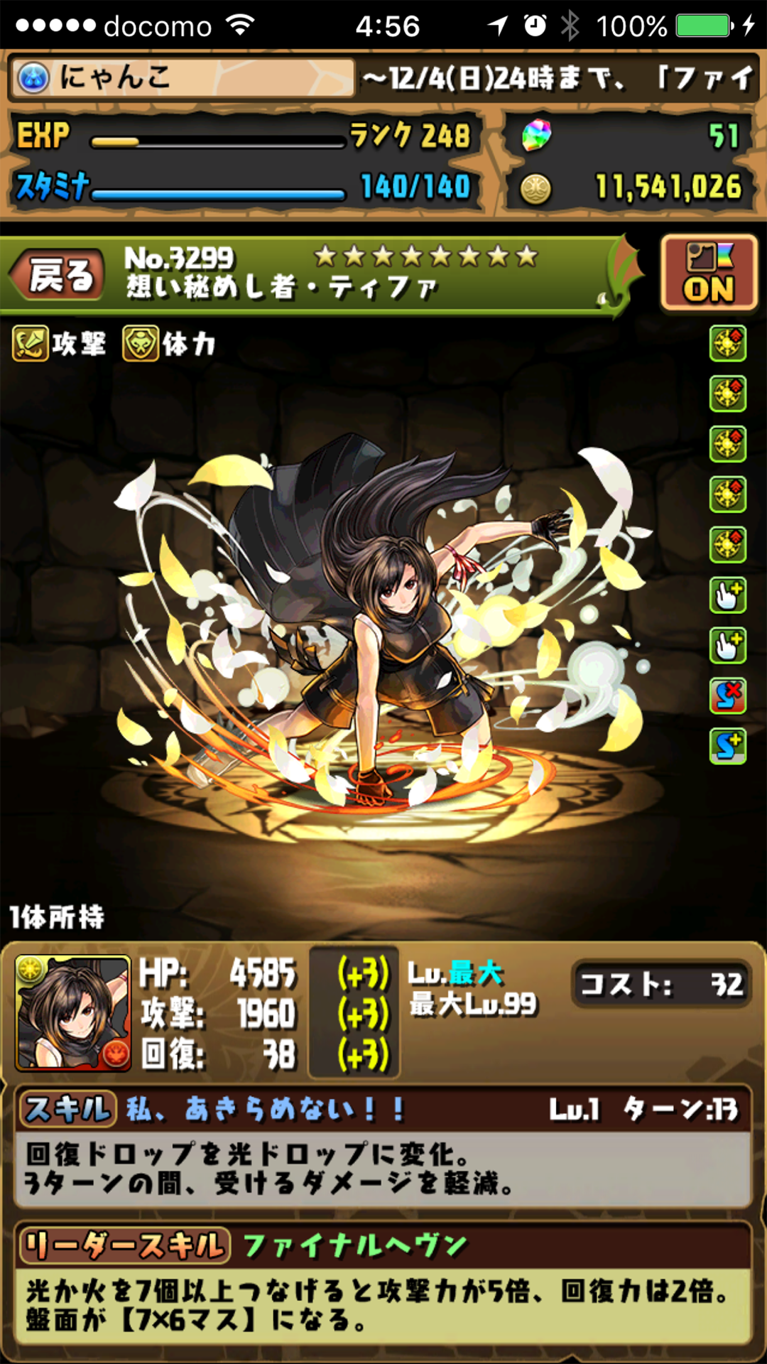 投稿日: 2016/11/28/ 04:38:02 投稿者: にゃんこ一年半ぶり、か……… 師匠のサイト見てて(キャラ使わせて貰って)どーしてもティファだけ欲しくなって、久々に出るまで回すことに(>_<)w しかし結果は最初の五千円でサクっと出現。はーい、ヤメ、ヤメ。てったーいww 被害ほぼなくて佳かったw 余は満足ニャッ。 そもそもやる気が無いんで、育てるかどうかはまた別のお話(>_<) なぜか素材持ってたんで、ここまでは育てた(>_<) もうおなかいっぱいw