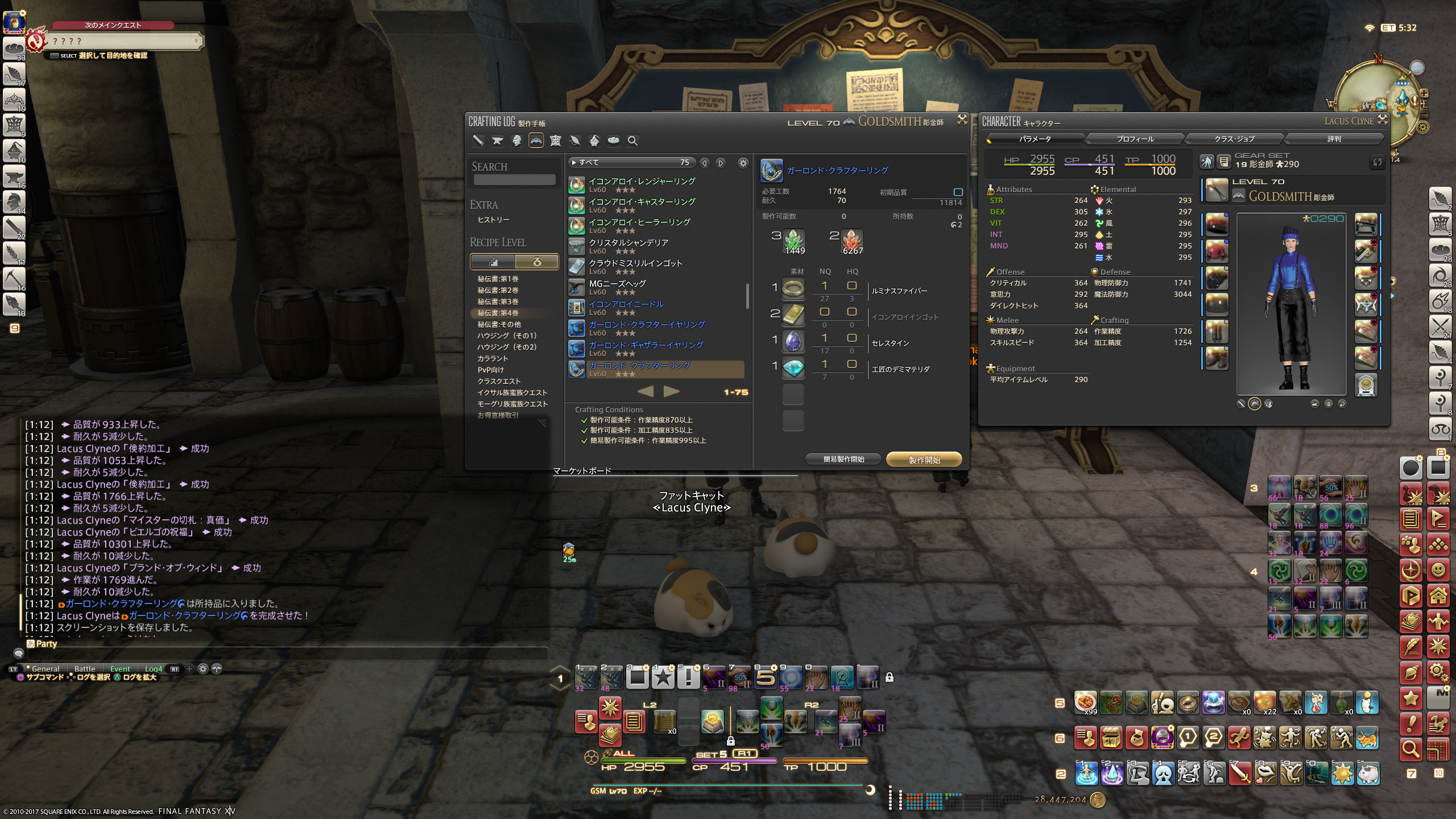 投稿日: 2017/07/11/ 01:19:09 投稿者: にゃんこ一発芸w かつてあれほどまでに作るのが大変だったガーロンド系防具、たまたま作る機会があったのでやってみたら、こんなかんじw まさかのブランド系一撃完成w 作業精度1,726でギリ、足りた模様(笑) 凄すぎるwww これが時の流れか………w