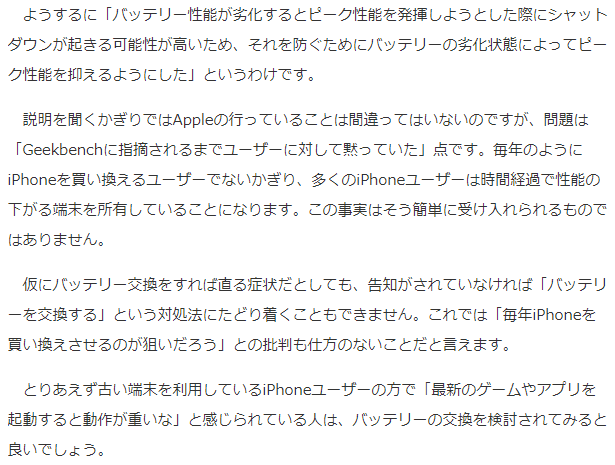 アップル側の言い分やリクツはどーでもよく、結果的に古いiPhoneは新型に買い換えてくださいって言ってるようなもんだからね、これw