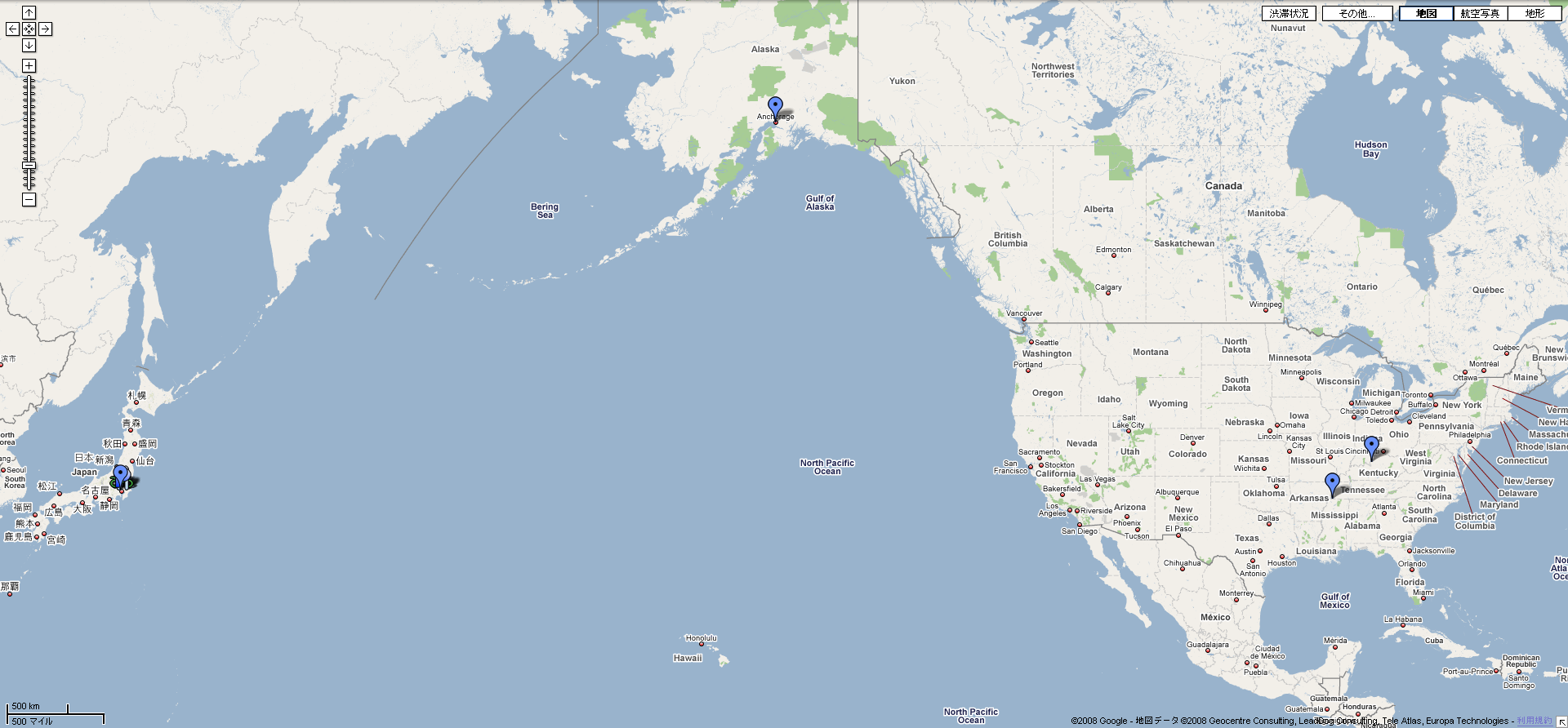 あーでもこーして地図を見ると、アラスカまで寄ってきてる方が日本へは近いのかな………