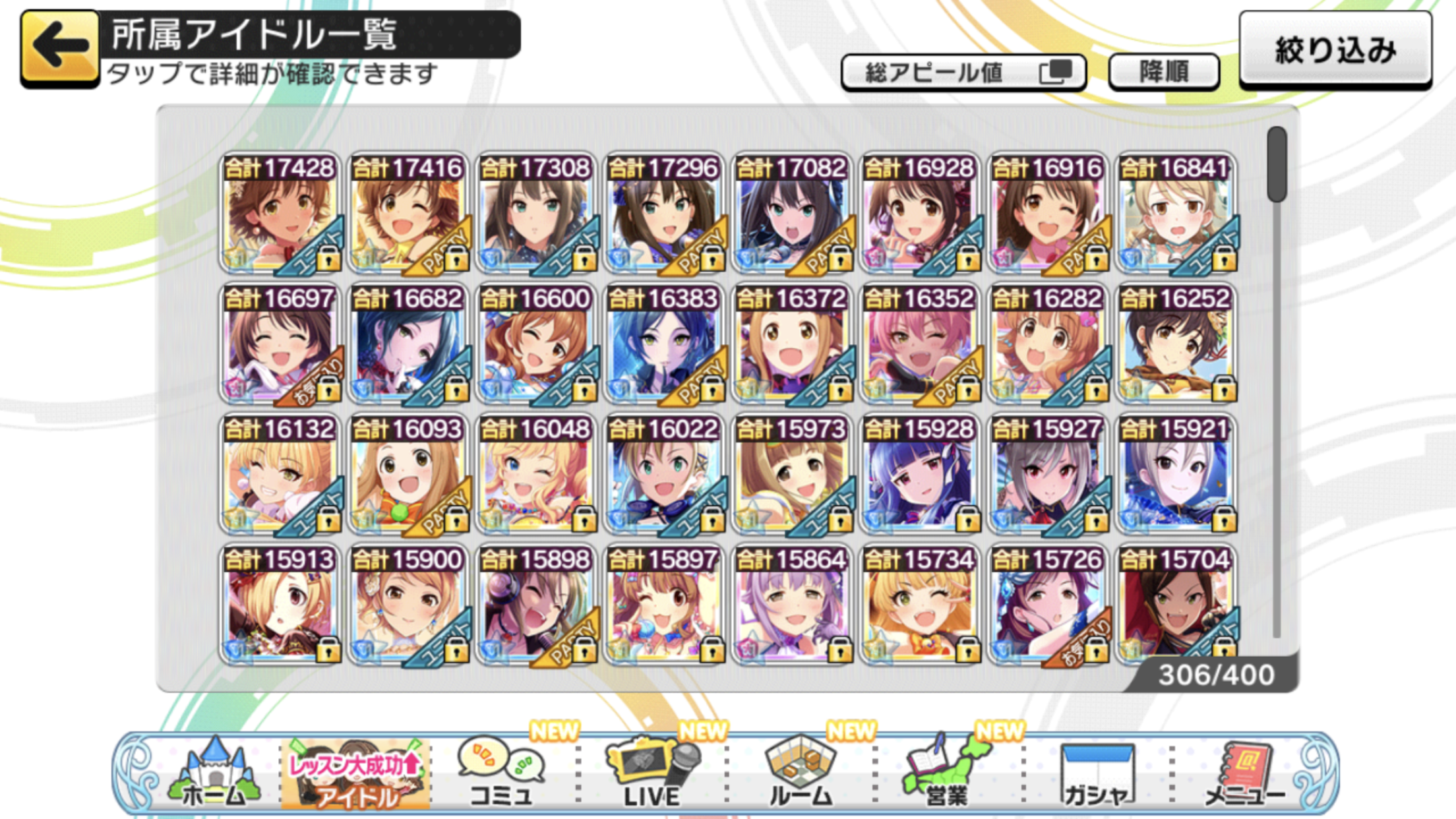 総合値が、キュートプリンセスの島村卯月だと16,928で、今回のキュートアビリティだと16,697??